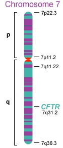 CF Mutations: CF is caused by a defect on the CF gene also known as the CFTR (cystic fibrosis transmembrane conductance regulator). This gene is on chromosome 7 in the human DNA. The CFTR gene is composed of over 230,000 base pairs. These base pairs are the "instructions" to make a protein that is 1480 amino acids long.
